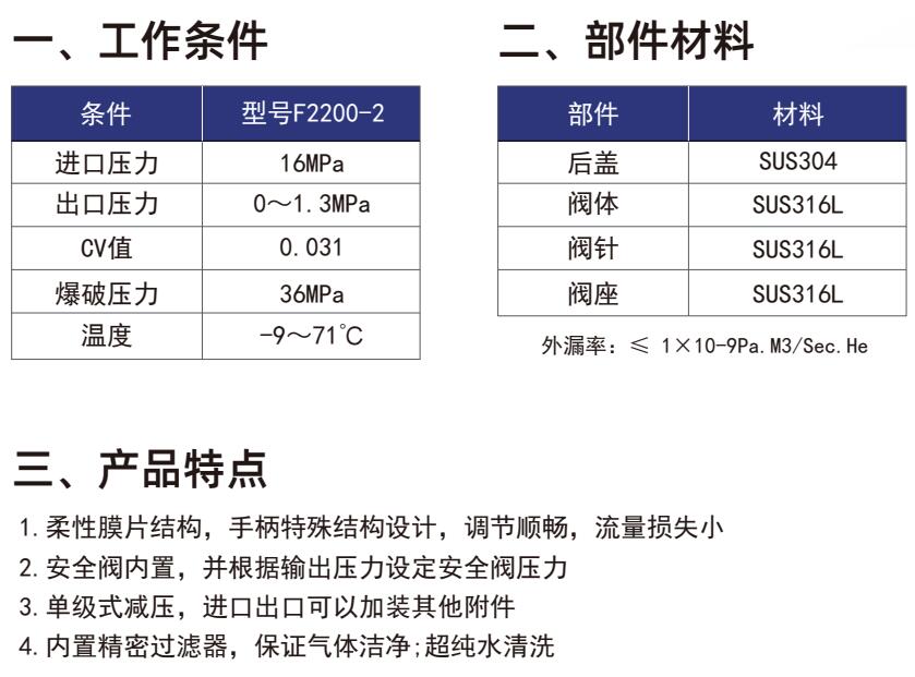 F2200-2氣體減壓器。單級膜片式;中高壓力輸入,低壓中高流量輸出,輸出壓力穩(wěn)定;適用于標準氣體、中高流量、低濃度(≤1%)腐蝕性氣體等。