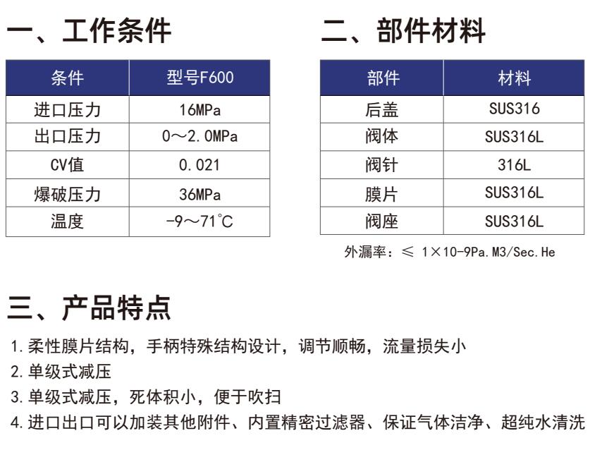 F600單級膜片式設(shè)計(jì);高壓輸入,輸出壓力穩(wěn)定;適用于標(biāo)準(zhǔn)氣體、高純氣體、低濃度(≤1%)腐蝕性氣體等。